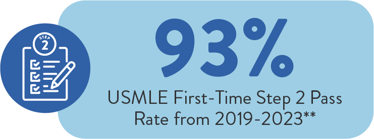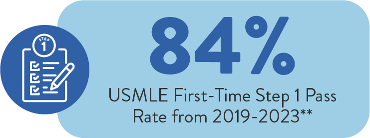 **First-time pass rate is the number of students passing the USMLE Step 1 exam on the first attempt divided by the number of students whose first attempt was in 2018-2022. In order to sit for the USMLE Step 1 exam students must successfully complete the Medical Sciences curriculum.